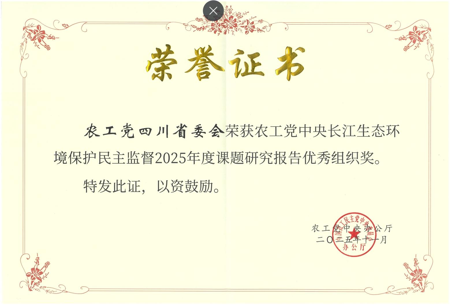 近日,农工党中央通报长江生态环境保护民主监督2025年度课题研究报告评选结果,省委会选送的22篇研究报告获奖,其中,一等奖1篇、二等奖3篇、三等奖8篇、优秀奖10篇;省委会连续四年获长江生态环境保护民主监督课题研究报告优秀组织奖。
