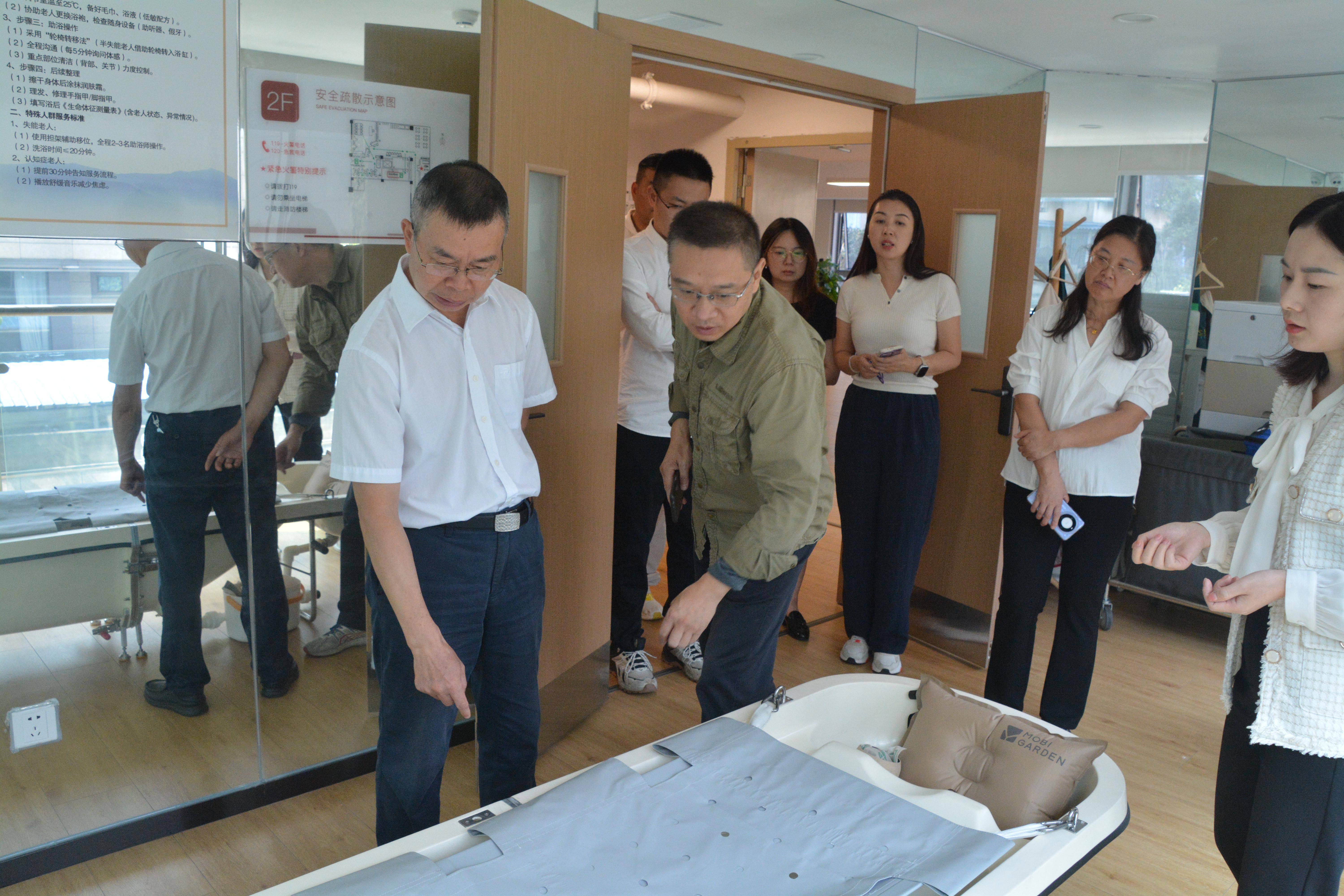 在青羊区少城街道养老服务中心,调研组详细了解了该中心由老旧办公楼改造而成的“嵌入式”综合服务模式,对其突出医养结合特色,实现医疗与养老无缝衔接的运营理念印象深刻;随后,调研组前往青羊区草堂街道养老服务中心,重点了解其开展的上门助浴服务。针对失能、半失能老人“洗澡难”问题,中心组织专业助浴团队,携带便携式助浴设备,为有需求的老年人提供安全、便捷的入户助浴服务,有效解决了家庭照护中的实际困难。同时,中心还设有认知障碍照护专区,通过专业环境设计和非药物干预手段,为认知障碍老人提供日间照护支持。调研组对其聚焦特殊老年群体、提供精细化上门服务的模式给予肯定。
